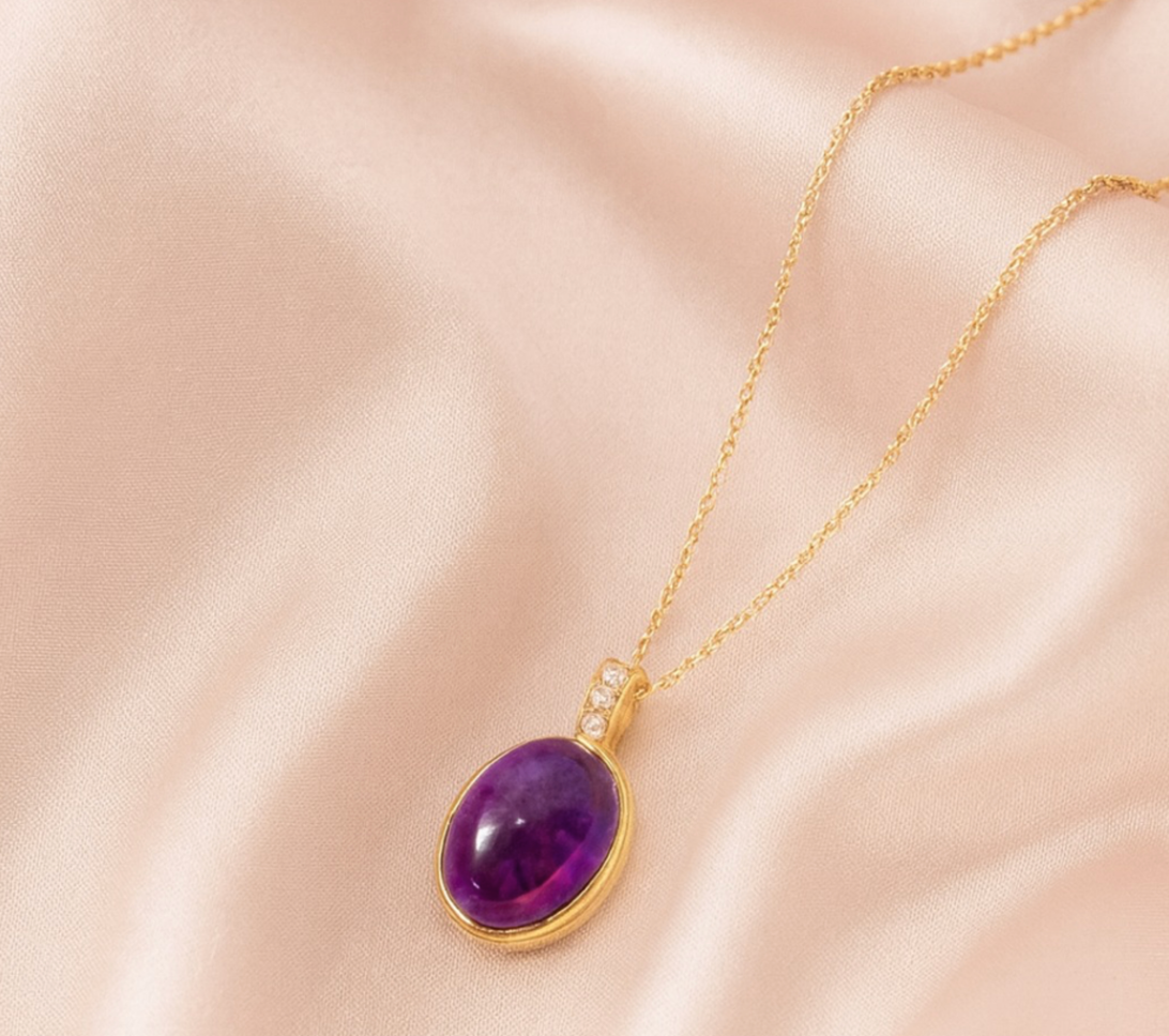 A statement of elegance and mystique, this pendant showcases a vivid 10.78 ct amethyst encased in 14K gold, accented with a delicate frame of sparkling diamonds. Its deep violet tones and refined silhouette evoke sophistication, making it perfect for both evening allure and modern refinement.