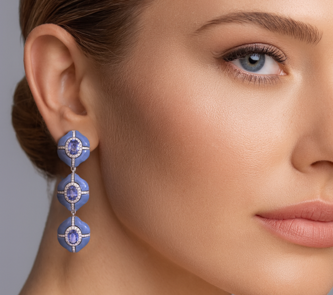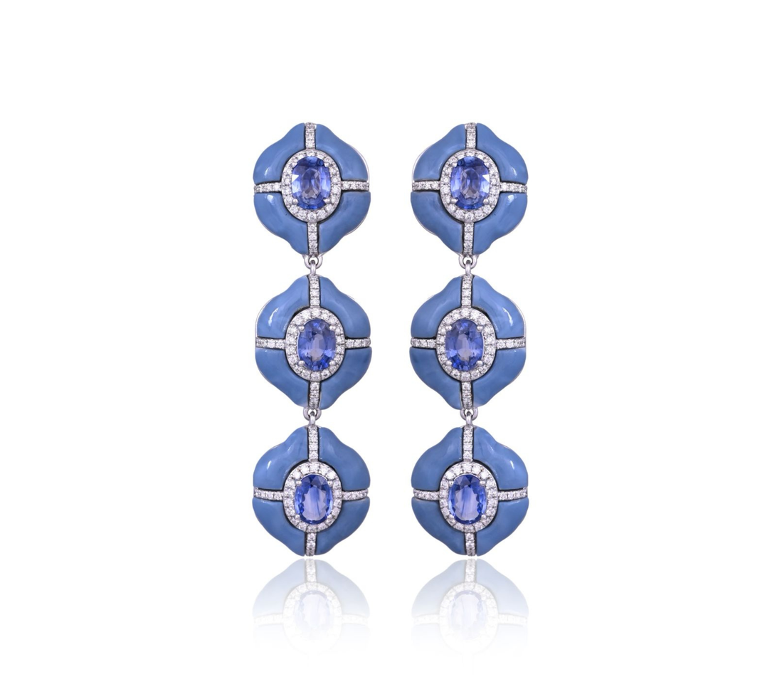 The Azure Reverie Earrings capture the serene beauty of twilight skies with a captivating blend of deep blue sapphire, iridescent opal, and dazzling diamonds. Crafted in 14K white gold, these earrings radiate sophistication — their fluid design reflecting light with every movement for an ethereal, dreamlike allure.