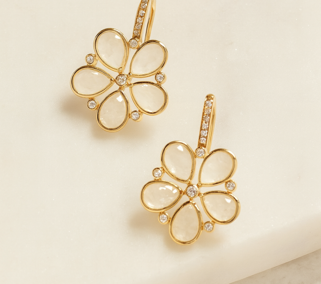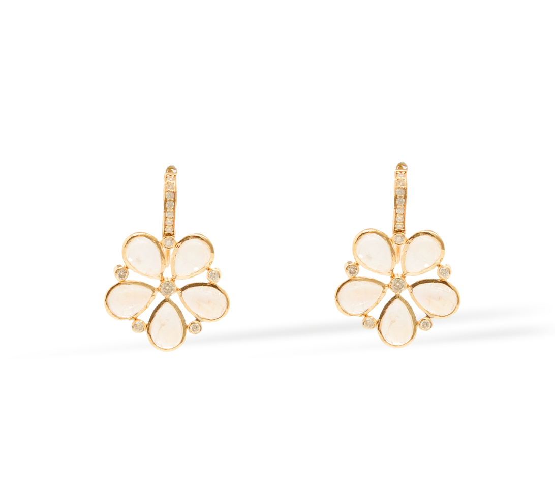 Delicate floral-inspired earrings crafted in 14K yellow gold, adorned with pear-cut moonstones and accent diamonds. The soft iridescence of the moonstones captures a gentle glow, making these earrings a timeless piece that blends grace and modern femininity. Perfect for both everyday wear and elegant occasions.