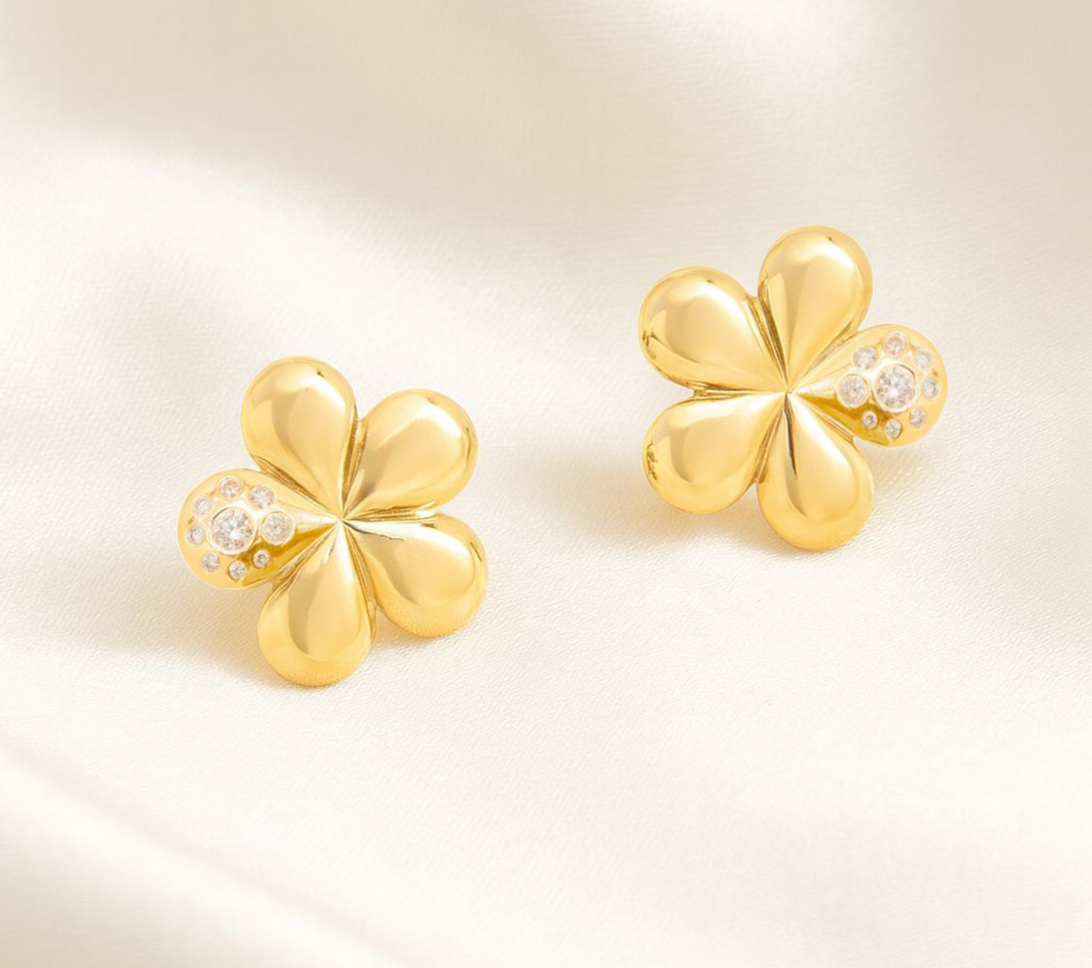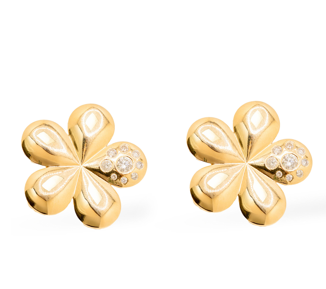 Elegant floral-inspired earrings crafted in 14K yellow gold, featuring intricate petal details accented by pavé-set diamonds. Their luminous design captures the light beautifully, offering a refined balance between timeless sophistication and everyday wearability.