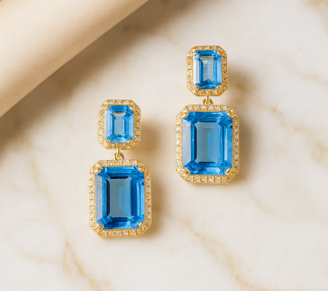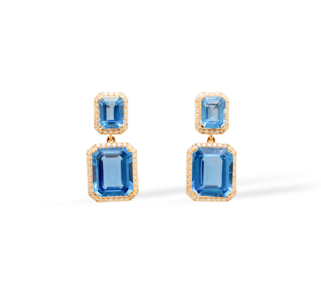Elegant drop earrings crafted in 14K yellow gold, featuring deep blue nano-artificial stones totaling 16.79 carats. Surrounded by pavé-set diamonds, each stone radiates a mesmerizing glow, blending bold color with refined sparkle. Designed for timeless sophistication, they transition effortlessly from statement evenings to graceful daytime allure.