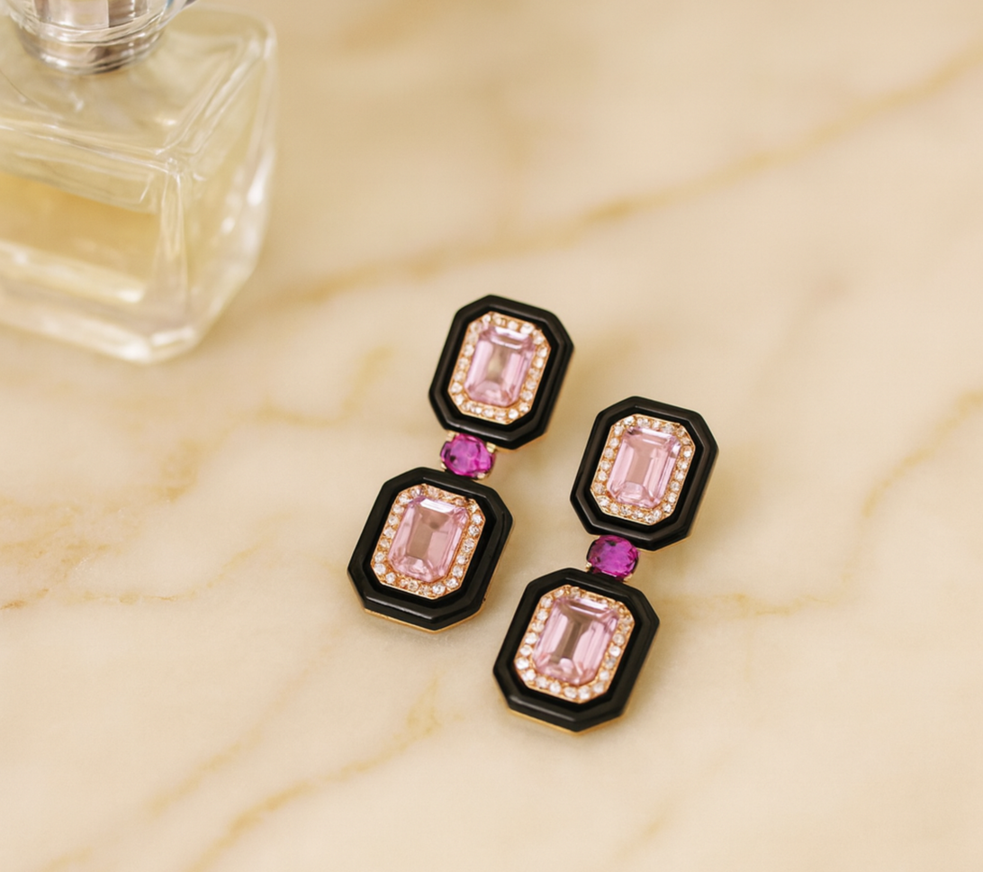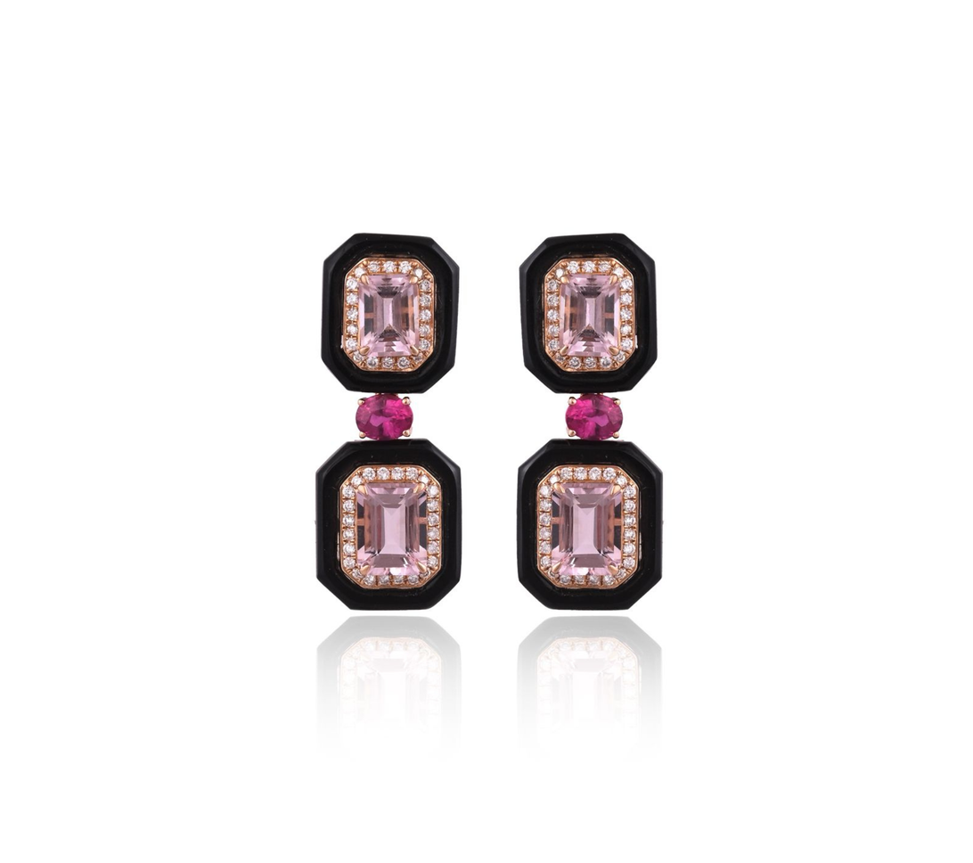 A symphony of contrast and allure, the Noir Rose’ Earrings blend deep onyx with the soft blush of morganite and the passionate hue of ruby. Set in 14K yellow gold and accented by 0.5 carats of brilliant diamonds, these earrings embody modern romance — bold, feminine, and irresistibly elegant.