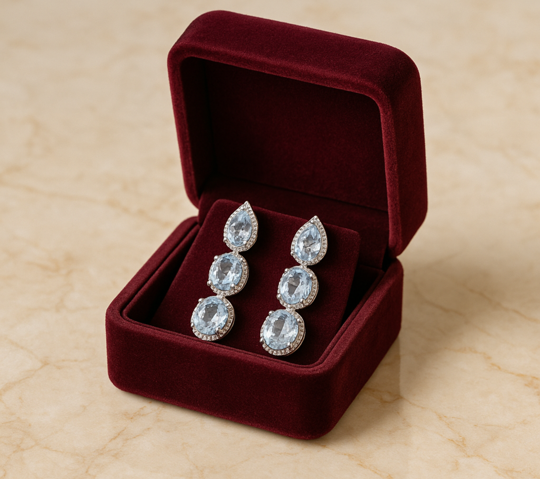 Evoking the quiet majesty of frozen horizons, the Arctic Grace Drops capture the pure, crystalline beauty of winter light. Cool aquamarine stones radiate an icy luminosity, while delicate diamonds add a refined sparkle—creating a look that feels serene, elegant, and effortlessly elevated.