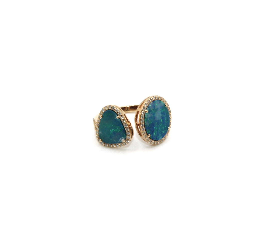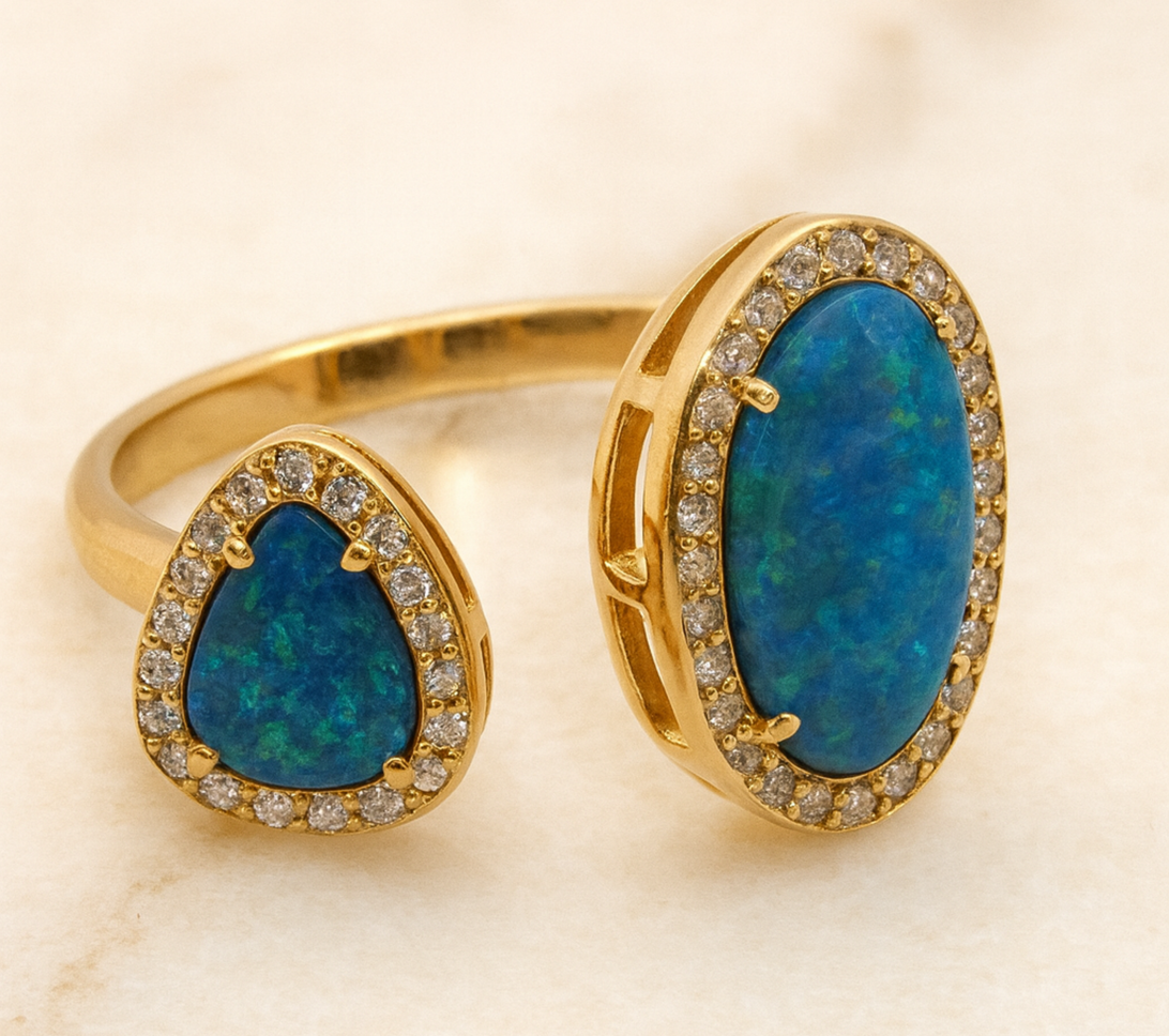 The Azure Sky Double Stone Ring captures the enchanting beauty of shifting skies with its twin opal gemstones shimmering in deep blue and green hues. Each stone is uniquely shaped and encircled by a delicate halo of white diamonds, creating a radiant balance between organic form and refined design. Crafted in gold, this open-style ring feels modern yet timeless — a subtle statement of elegance and individuality.
