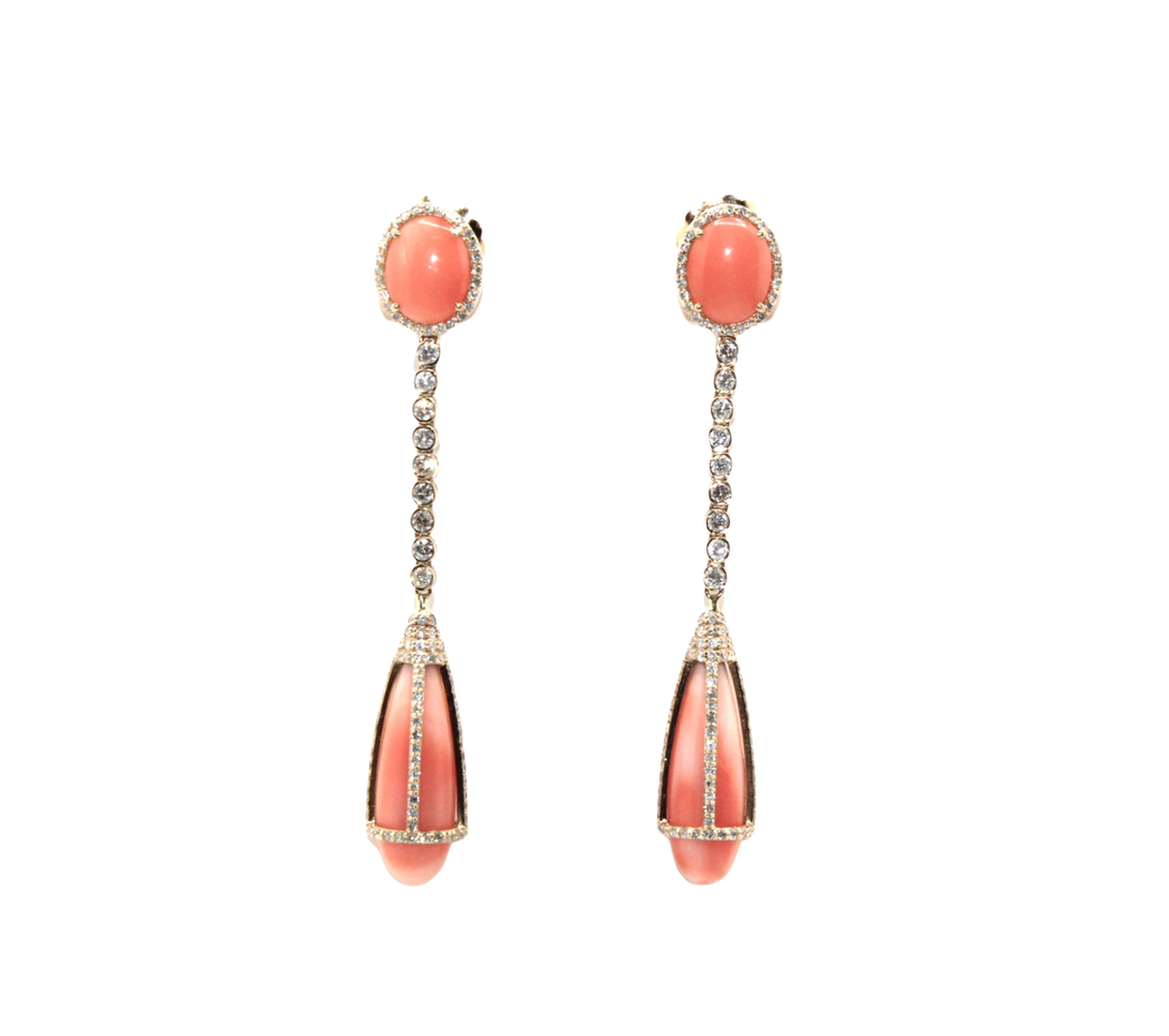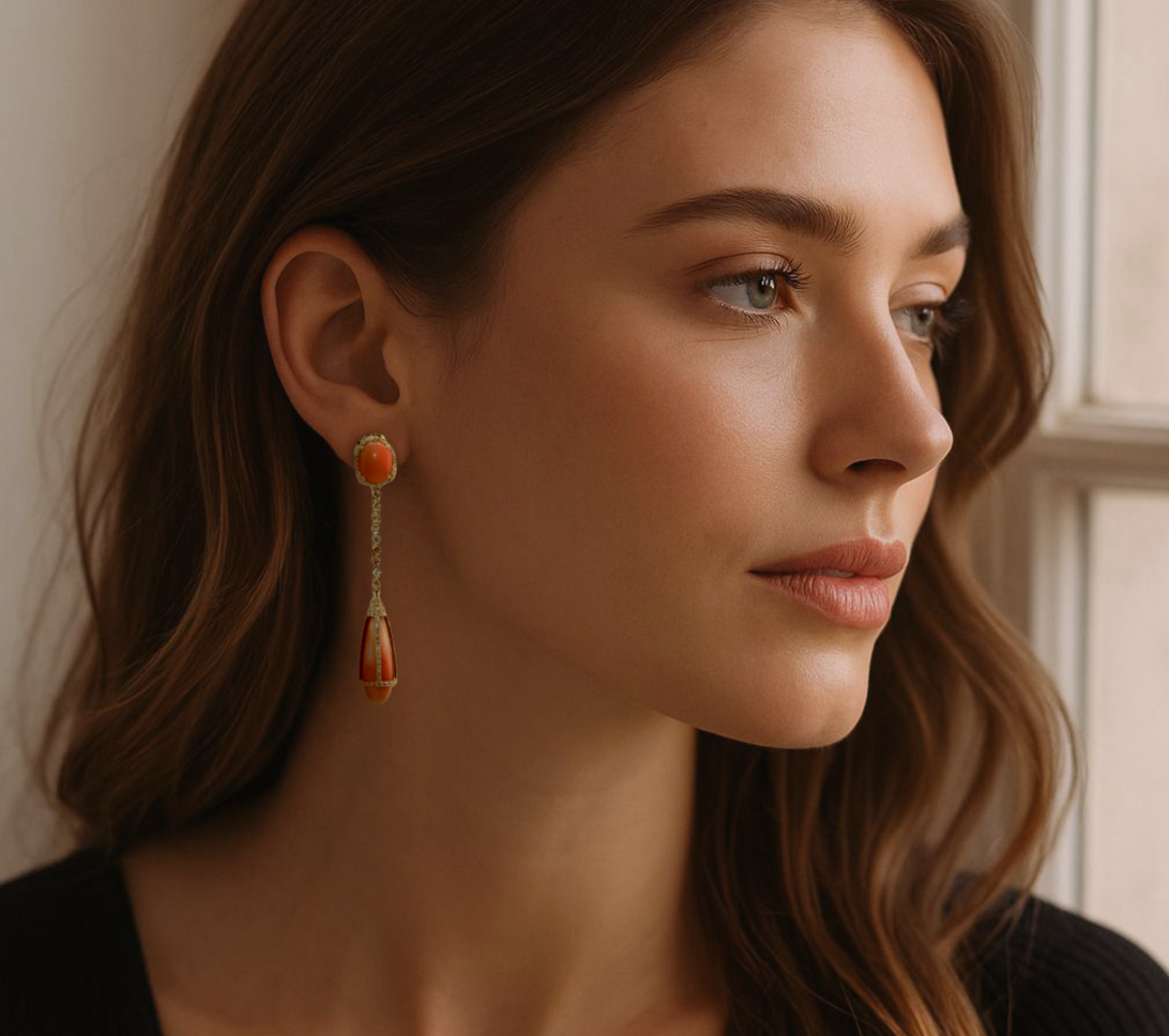 The Coral Drop Earrings exude refined warmth and timeless allure. Crafted in lustrous gold, each earring features a captivating coral stone (19.35 ct) delicately suspended from a line of brilliant-cut diamonds (1.36 ct) that lend fluid sparkle and movement. The harmonious blend of soft coral hues and shimmering diamonds creates a look that’s both radiant and sophisticated — perfect for evening elegance or a statement daytime accent.