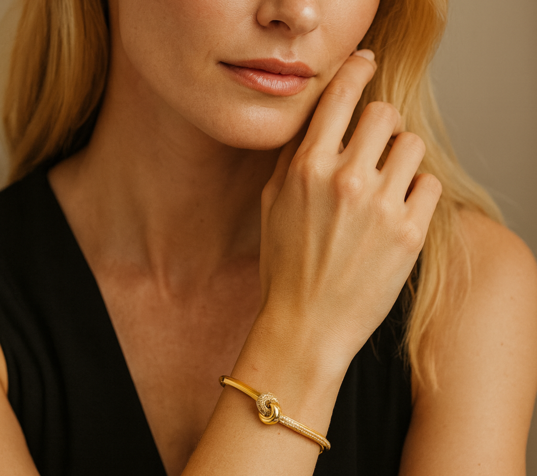 A statement of timeless Parisian elegance. The Gilded Knot Bangle is meticulously crafted in 18K yellow gold and adorned with pavé-set white diamonds, creating a refined harmony of polish and sparkle. Perfect from day to evening, this sculptural design embodies connection, grace, and effortless sophistication. ✨