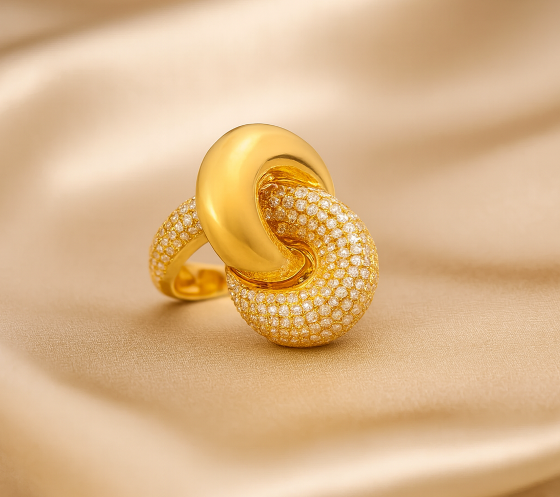 An elegant interlocking knot ring crafted in 14K yellow gold, symbolizing unity and timeless strength. Its sculptural curves are adorned with pavé-set diamonds totaling 1.32 carats, adding refined brilliance to the smooth, polished gold.