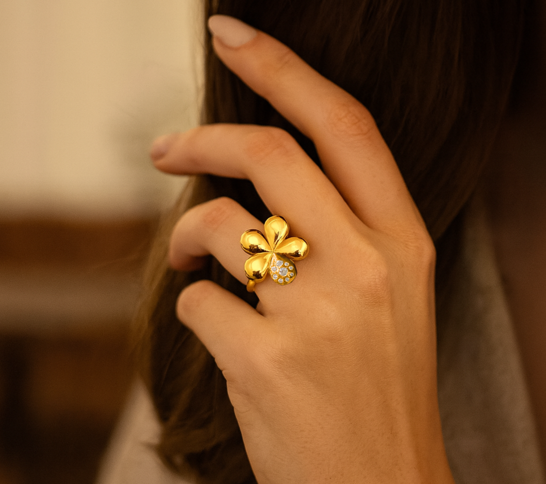 An elegant five-petal flower ring crafted in 14K yellow gold, designed with one pavé-set diamond petal for a refined hint of sparkle. The soft curvature of each petal adds dimension and grace, creating a piece that radiates femininity and timeless charm — perfect for both everyday elegance and evening sophistication.