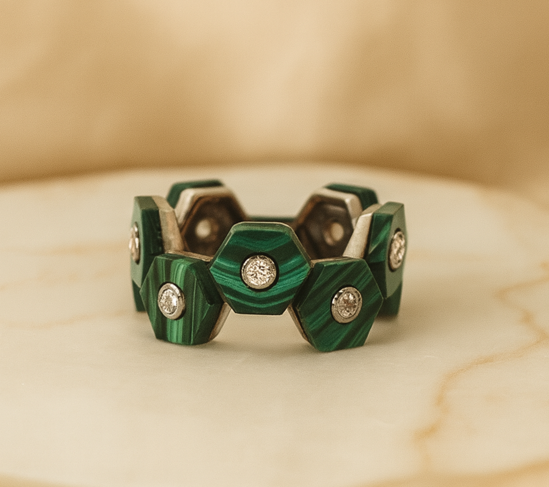 Vibrant, polished, and architecturally bold — the Hexagon Malachite & Diamond Ring highlights the natural beauty of malachite through a modern geometric silhouette. Each hexagonal link showcases the stone’s signature banding — rich waves of emerald green that shift between deep and bright tones, giving the ring a dynamic, luxurious presence.