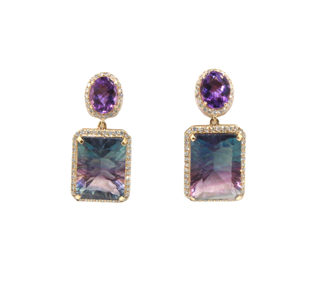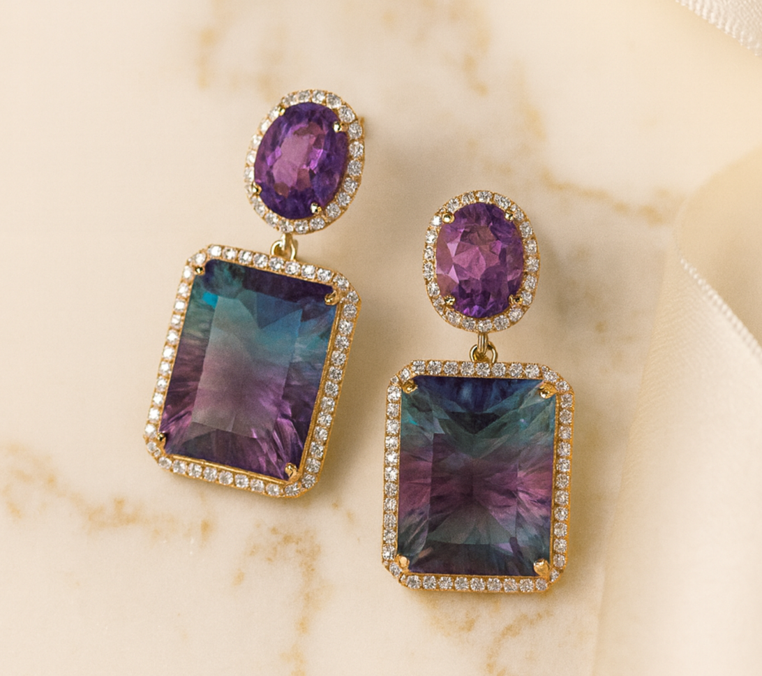 The Imperial Azure Earrings radiate refined sophistication through their striking play of color and light. Featuring vivid amethyst studs paired with rectangular fluorite stones that shift from deep violet to cool blue-green, the design captures a mesmerizing depth reminiscent of royal jewels. Each gem is surrounded by a halo of pavé-set diamonds, adding brilliance and balance to this timeless statement piece.