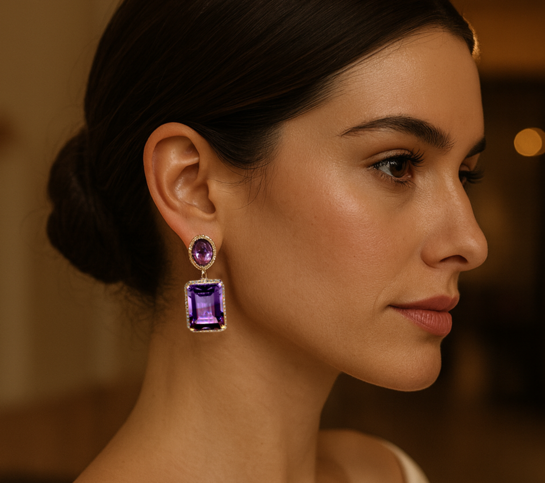 Radiating the elegance of twilight gold and royal purple, the Imperial Sun Earrings blend ametrine and amethyst in a symphony of light and luxury. The rectangular ametrine stones display a seamless gradient of golden and violet hues, crowned by brilliant-cut amethysts and framed with pavé-set diamonds. Crafted in gold, this design captures balance and brilliance — perfect for evening refinement or luminous daytime elegance.
