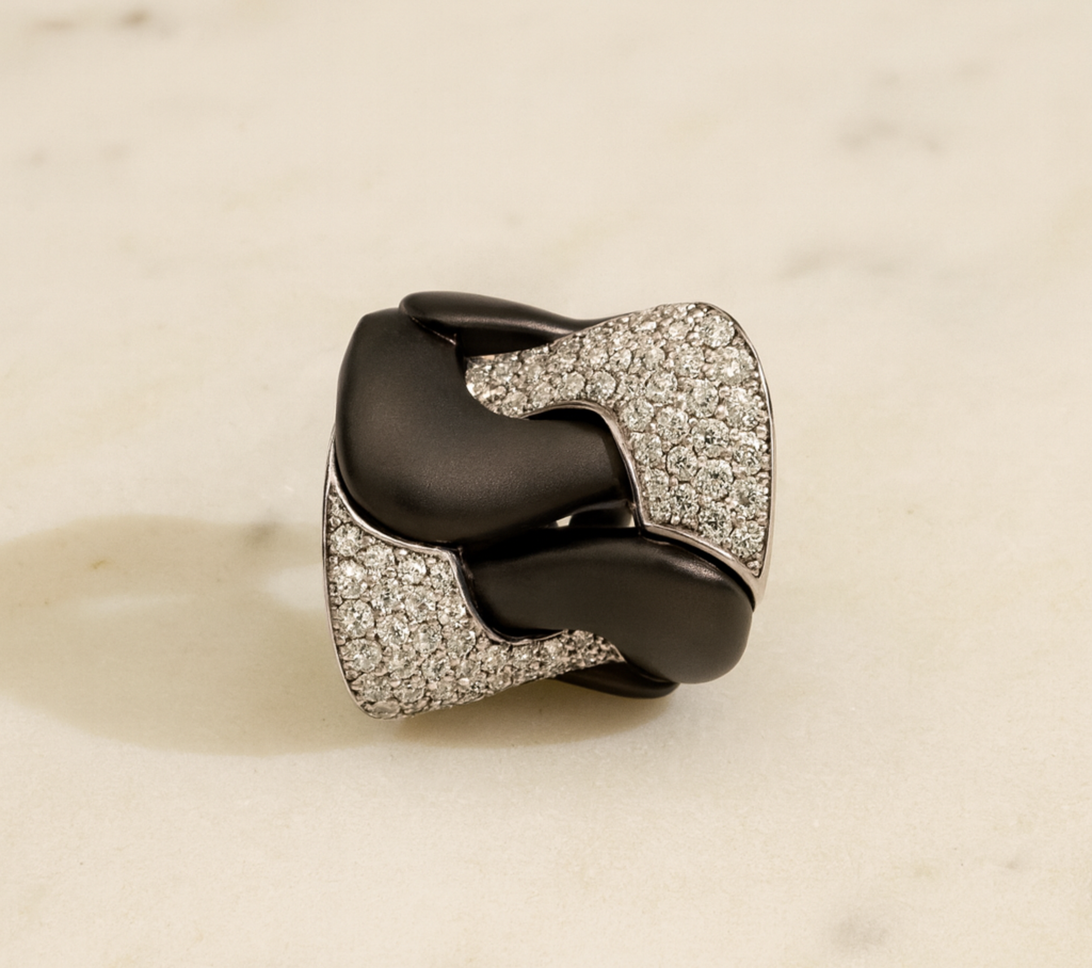 Sleek, sculptural, and undeniably modern — the Titanium Link Ring showcases the iconic interlocking design in a bold, compact form. Crafted in smooth matte titanium, each curved link flows seamlessly into the next, creating a powerful silhouette with refined depth. Sweeping pavé sections of white diamonds, framed elegantly in white gold, add brilliant contrast against the dark titanium.