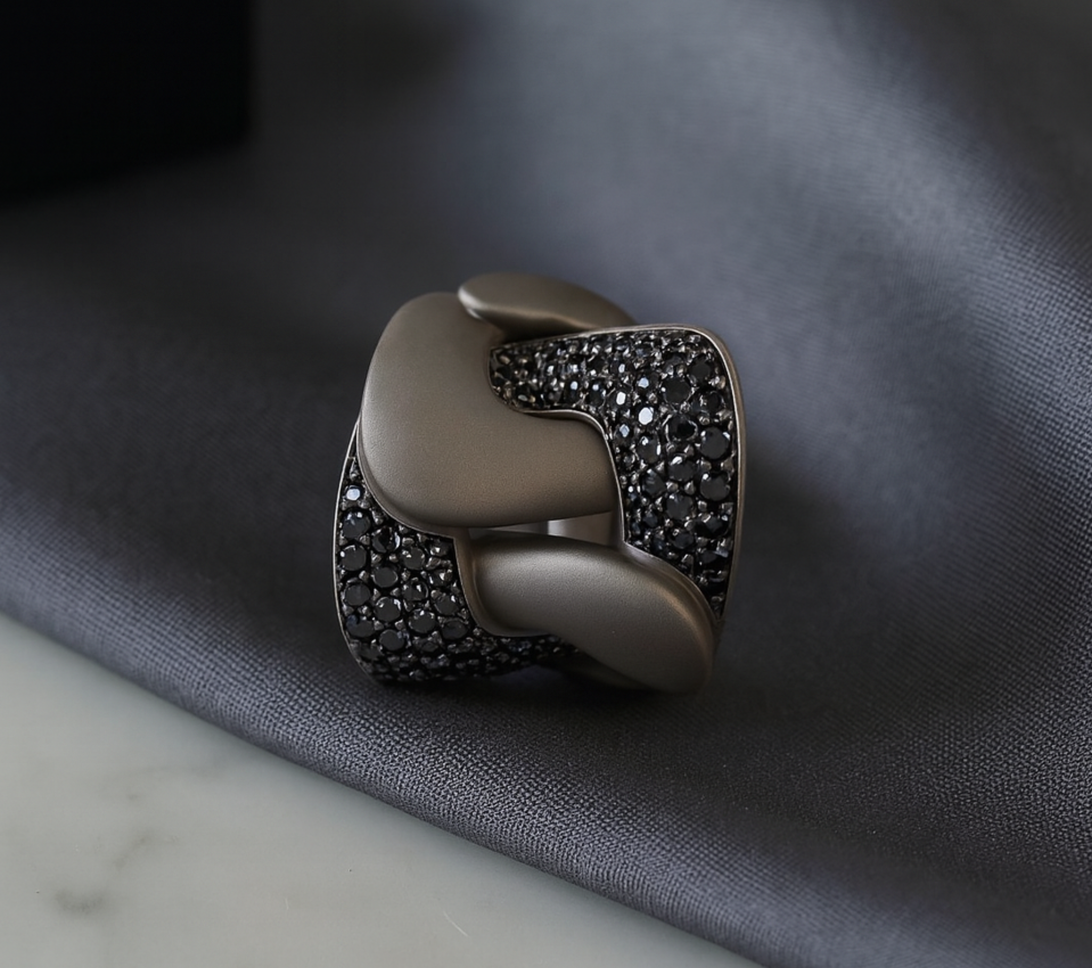 Dark, sleek, and unmistakably modern — the Titanium Link Ring transforms the signature interlocking silhouette into a bold statement of contemporary luxury. Sculpted in satin-matte titanium, each curved link flows seamlessly, creating a fluid architectural form with a powerful presence. Dense pavé sections of black diamonds add a deep, hypnotic shimmer that amplifies the ring’s refined drama.