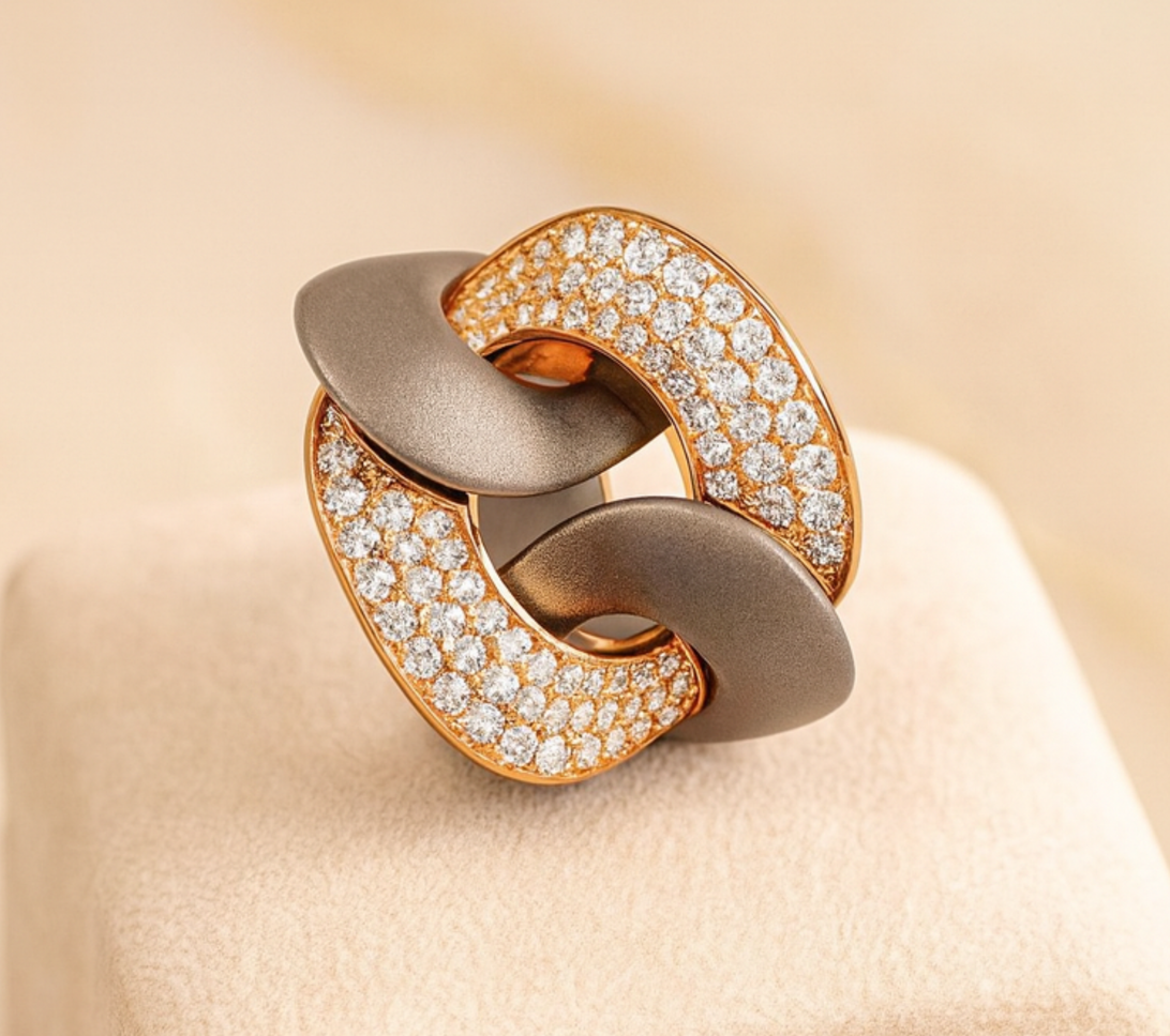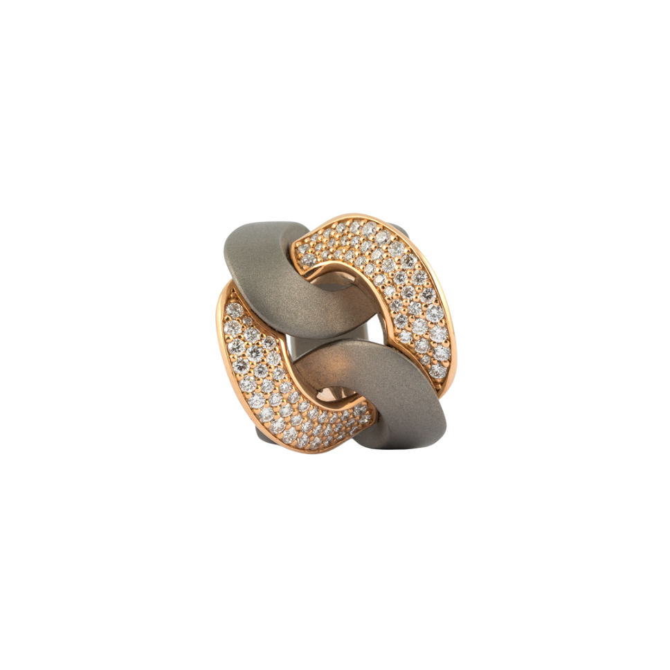 Radiant, sculptural, and exquisitely modern — the Titanium Shiny Link Ring elevates the signature interlocking silhouette with a luminous metallic sheen. Crafted in polished titanium with soft grey undertones, the curved links create a fluid, architectural form that instantly commands attention. Lavish pavé sections of white diamonds, framed in warm rose gold, add exceptional brilliance and a refined golden glow.