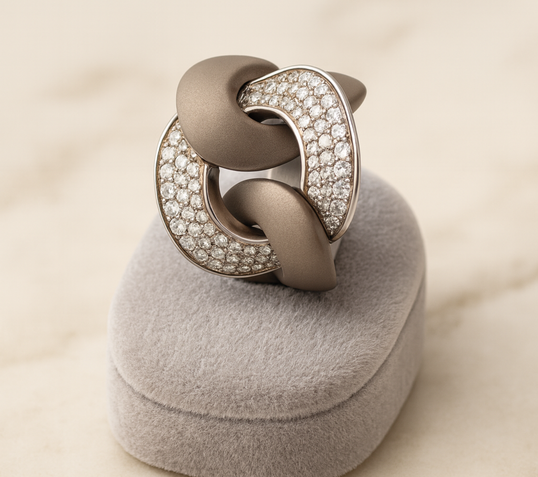 Elegant, sculptural, and radiantly modern — the Titanium Satin Link Ring brings the iconic interlocking silhouette into a luminous new expression. Crafted in smooth satin-matte titanium with a soft natural tone, each curved link flows seamlessly, forming a bold yet refined architectural statement. Lavish pavé sections of white diamonds add crisp brilliance, creating a striking contrast against the velvety titanium surface.