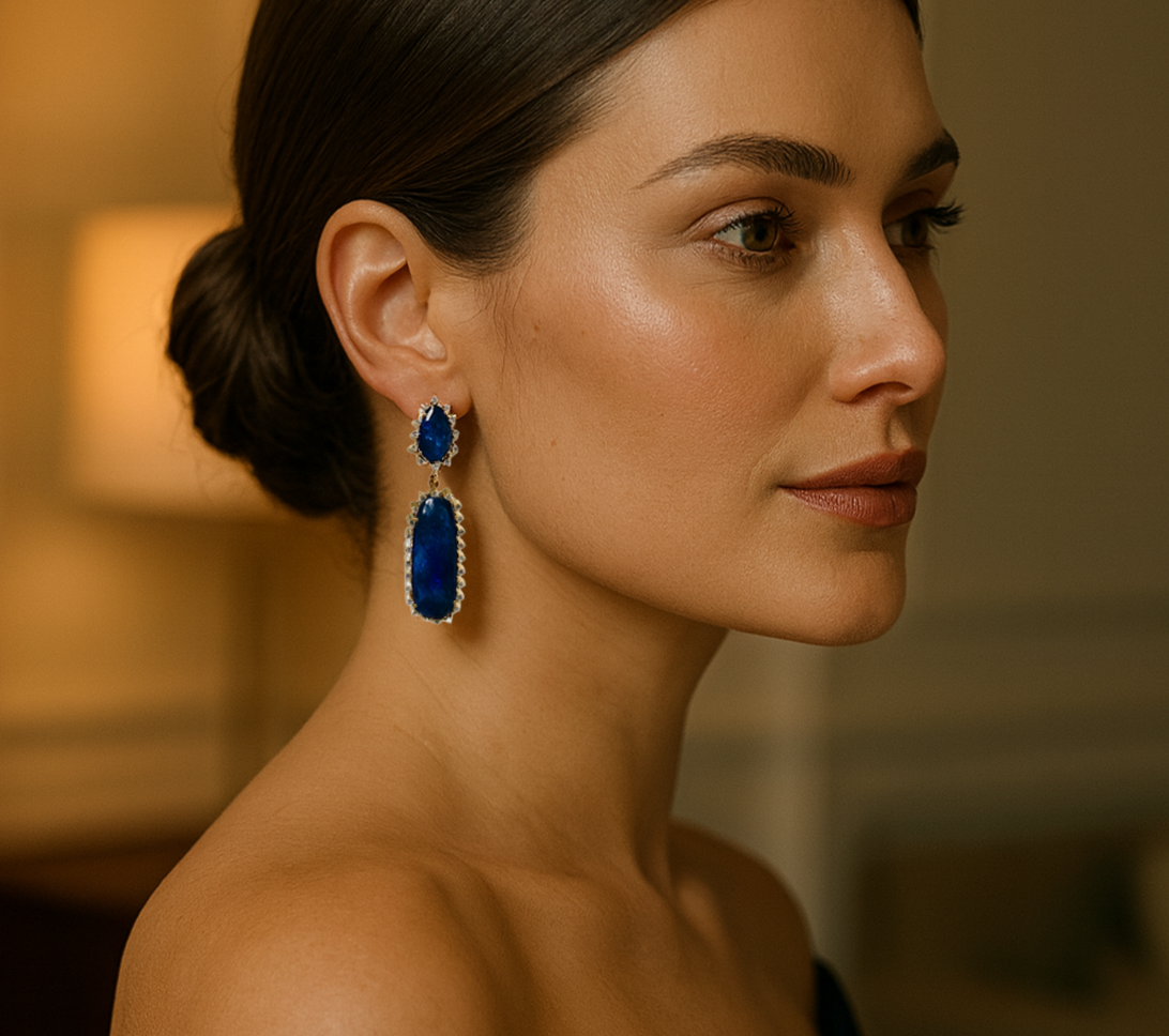 The Midnight Sky Opal Drops capture the enigmatic glow of the night sky in motion. Each earring showcases deep blue opals shimmering with flashes of violet and indigo, reminiscent of starlight over dark waters. Framed delicately in 14k gold and encircled by sparkling diamonds, these earrings strike the perfect balance between boldness and refinement. Their elongated silhouette adds graceful movement and luminous depth to any look — a true statement of celestial elegance.