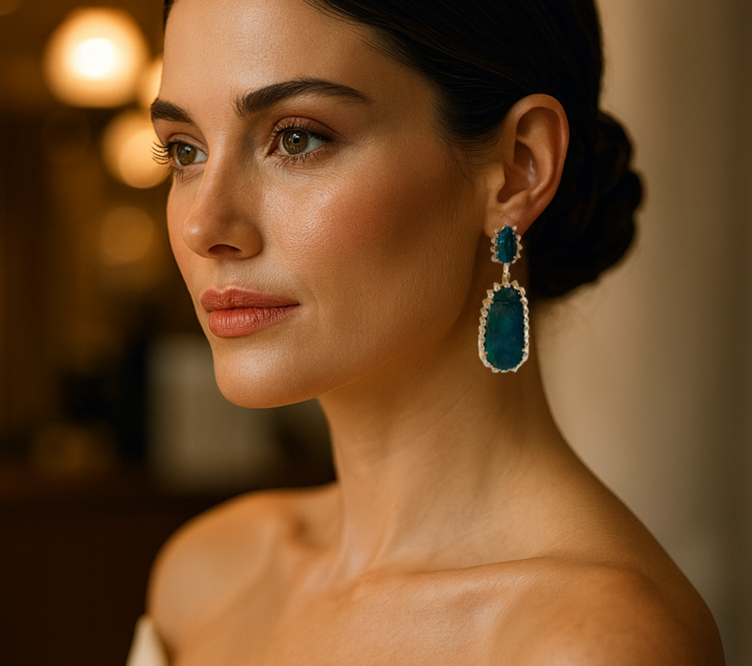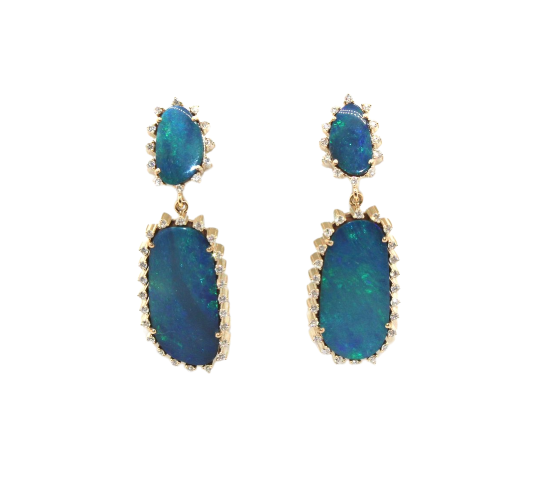 Lose yourself in the depth of the Midnight Sky Opal Earrings — where twilight hues meet radiant brilliance. These captivating earrings feature luminous opals that shimmer with deep blue and green fire, set in 14k gold and encircled by glimmering diamonds that evoke the stars of a midnight sky. Their elongated silhouette enhances movement and light, making them an unforgettable statement for evening allure or timeless sophistication.