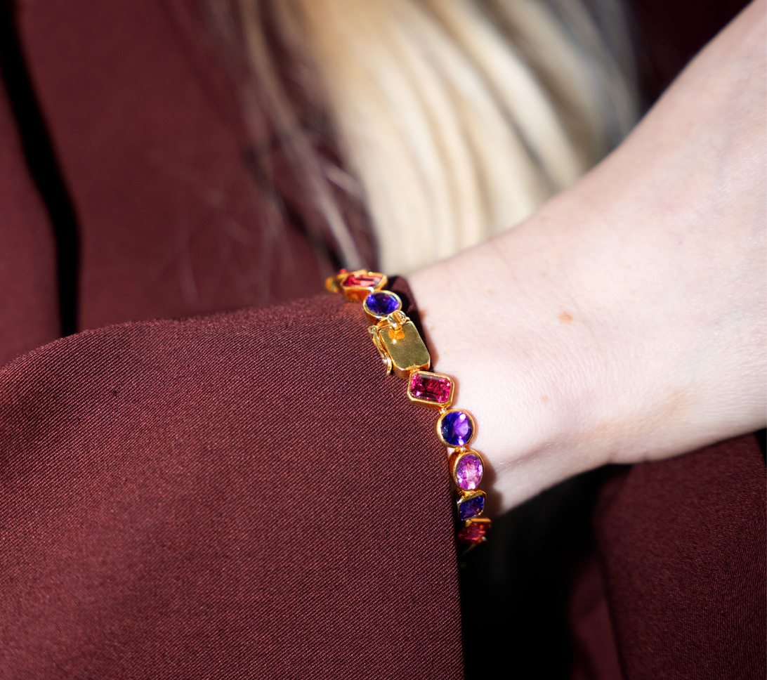 Add a burst of color to your collection with our 18K Yellow Gold Multi Gem Stone Royale Bracelet, a piece designed to shine from every angle. Vibrant amethyst, pink topaz, pink tourmaline, citrine, blue topaz, and multi-colored sapphires come together in 18K yellow gold, creating a radiant spectrum of elegance and joy.