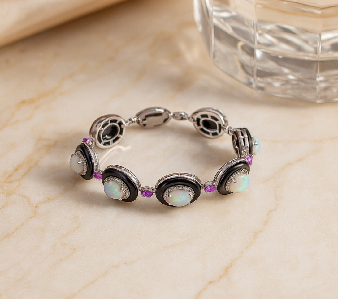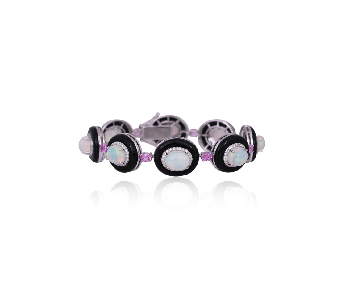 An exquisite bracelet that captures the harmony of light and shadow through a refined composition of opal, pink sapphire, black onyx, and diamond. Each stone is meticulously set to highlight its natural brilliance — from the opal’s soft iridescence to the deep allure of onyx. A statement of elegance that transitions effortlessly from day to evening.