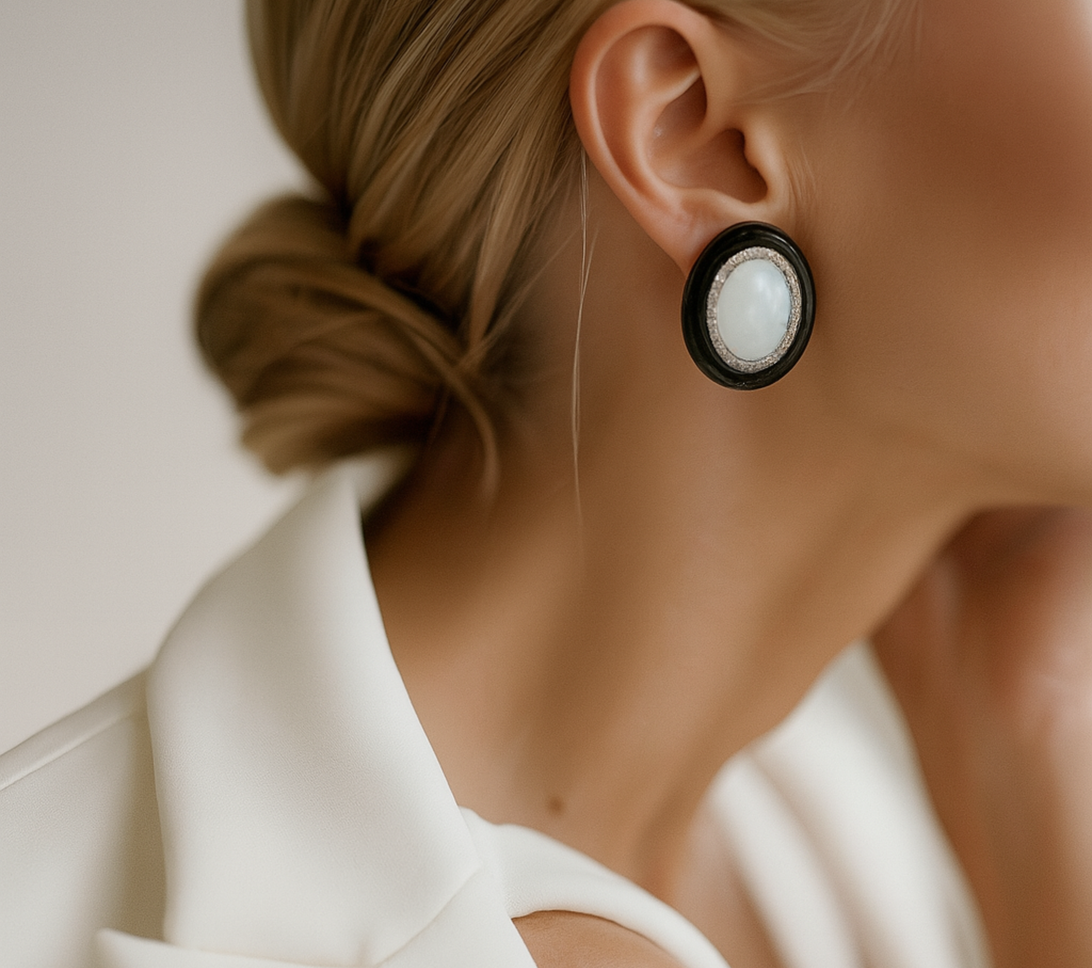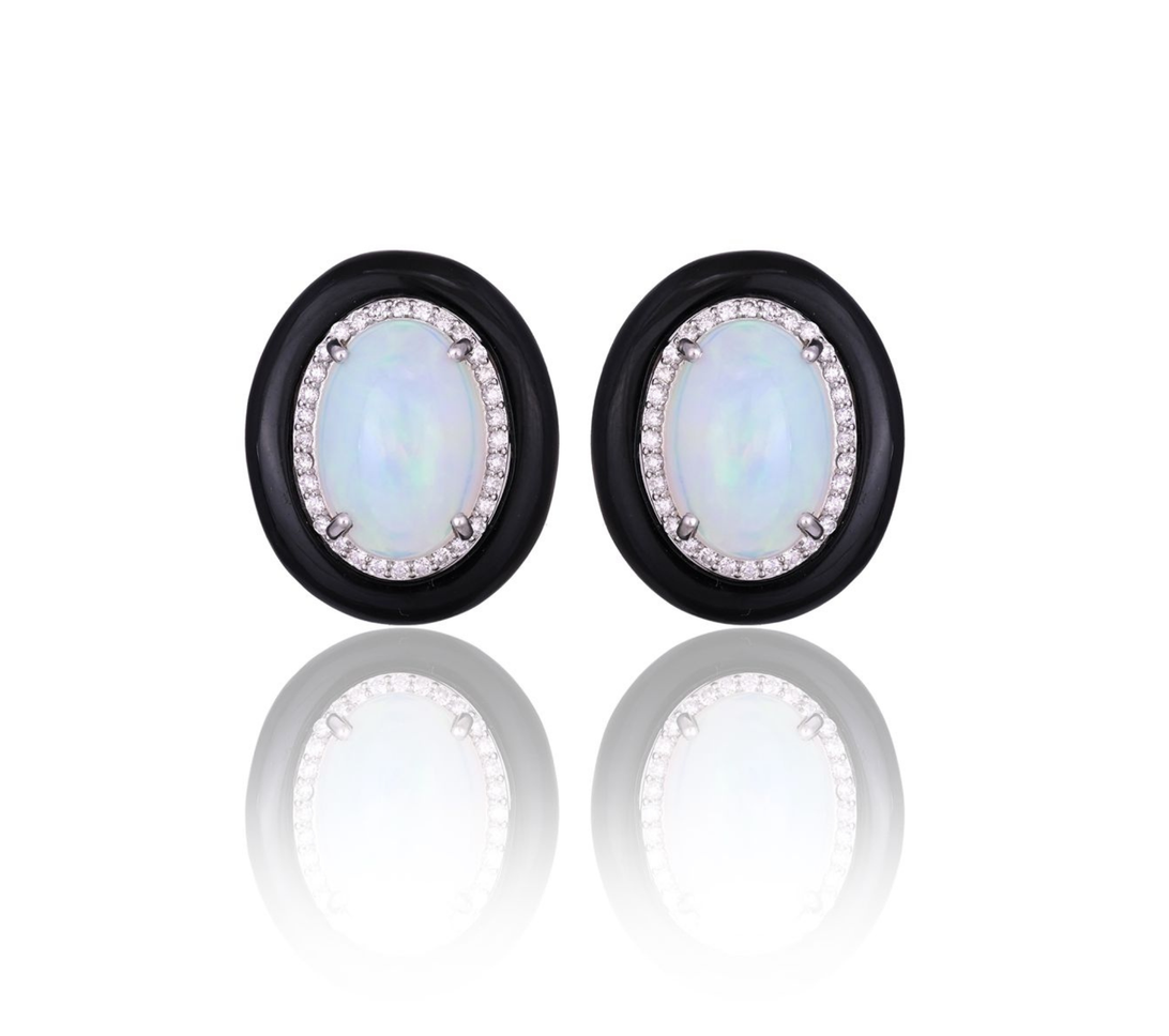 An exquisite harmony of light and shadow, the Nocturne Blanche Earrings feature iridescent opals paired with deep black onyx and accented by brilliant diamonds. Their refined contrast evokes celestial elegance — luminous, mysterious, and timelessly chic.