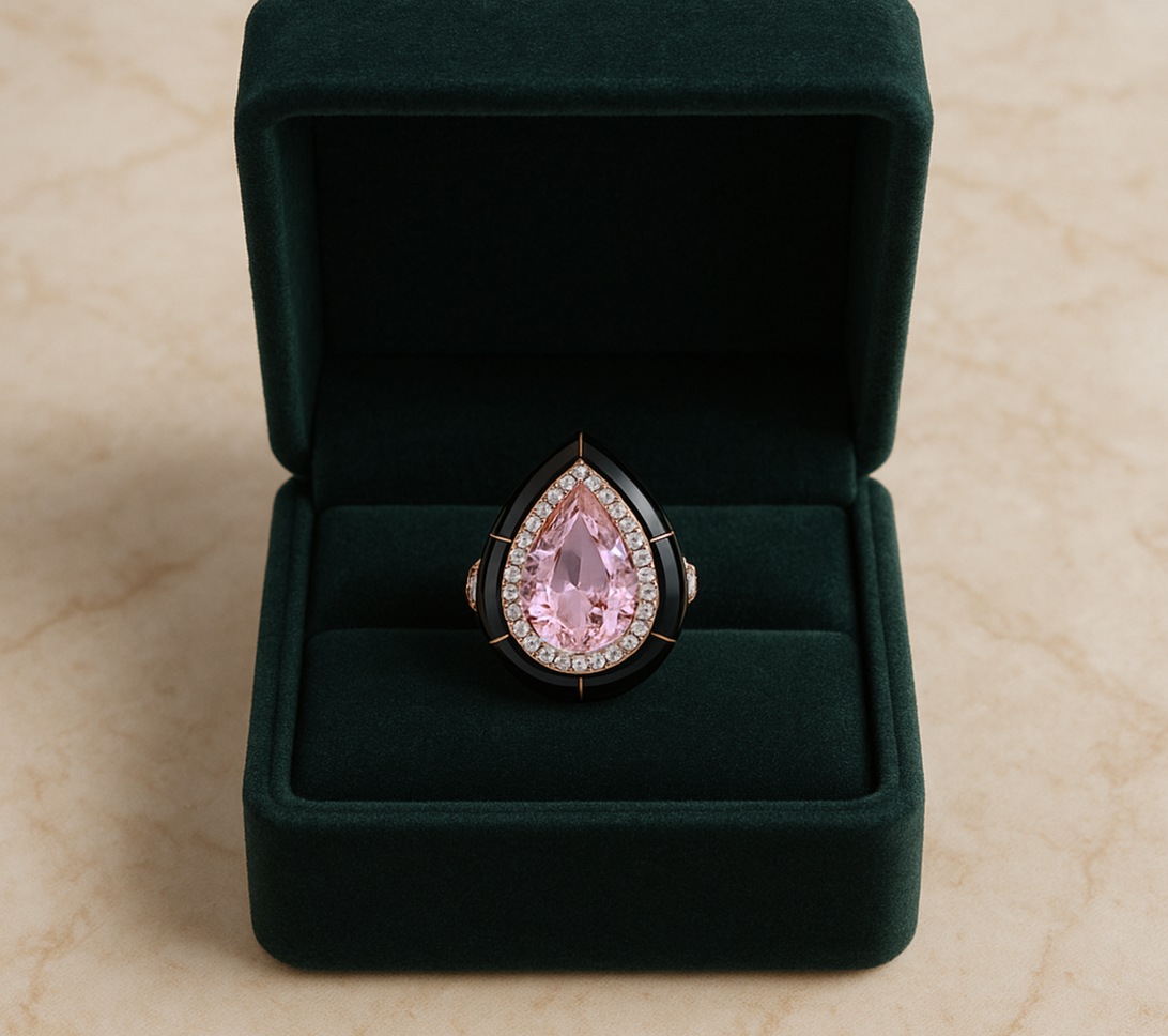 A bold yet elegant statement ring uniting the soft blush of morganite with the deep allure of black onyx and the radiant sparkle of diamonds. Its refined contrast and sculptural silhouette capture the essence of modern romance and timeless sophistication.