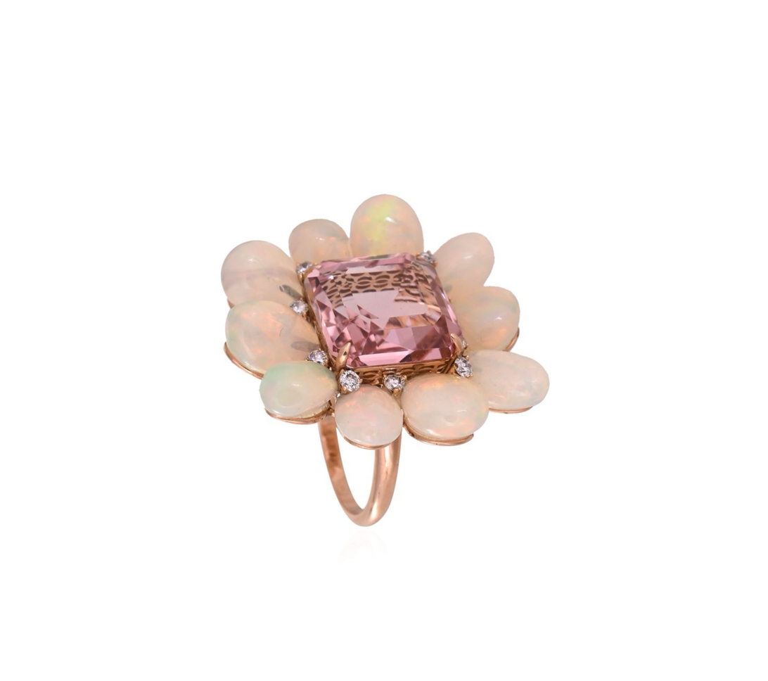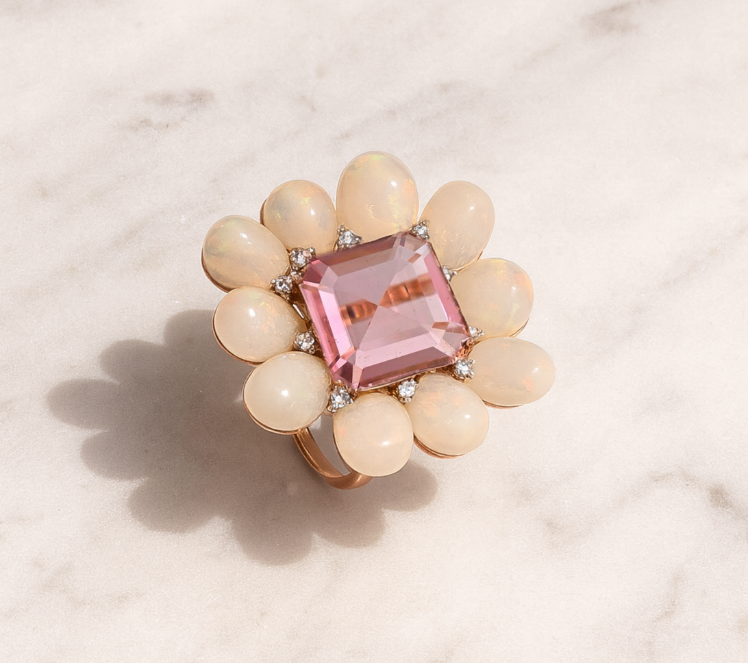 A statement floral ring featuring a radiant cushion-cut morganite framed by luminous cabochon opals and delicate round diamonds. The combination of soft iridescence and pastel warmth creates an ethereal, light-catching bloom that feels both bold and graceful.