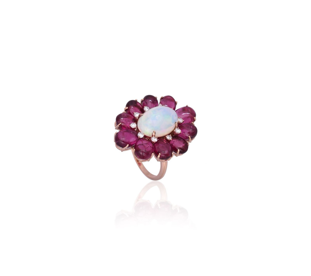 An enchanting floral-inspired ring featuring iridescent opals, vibrant tourmalines, and delicate diamonds. The interplay of pastel hues and shimmering light evokes a sense of ethereal grace, making it a true statement of feminine elegance.