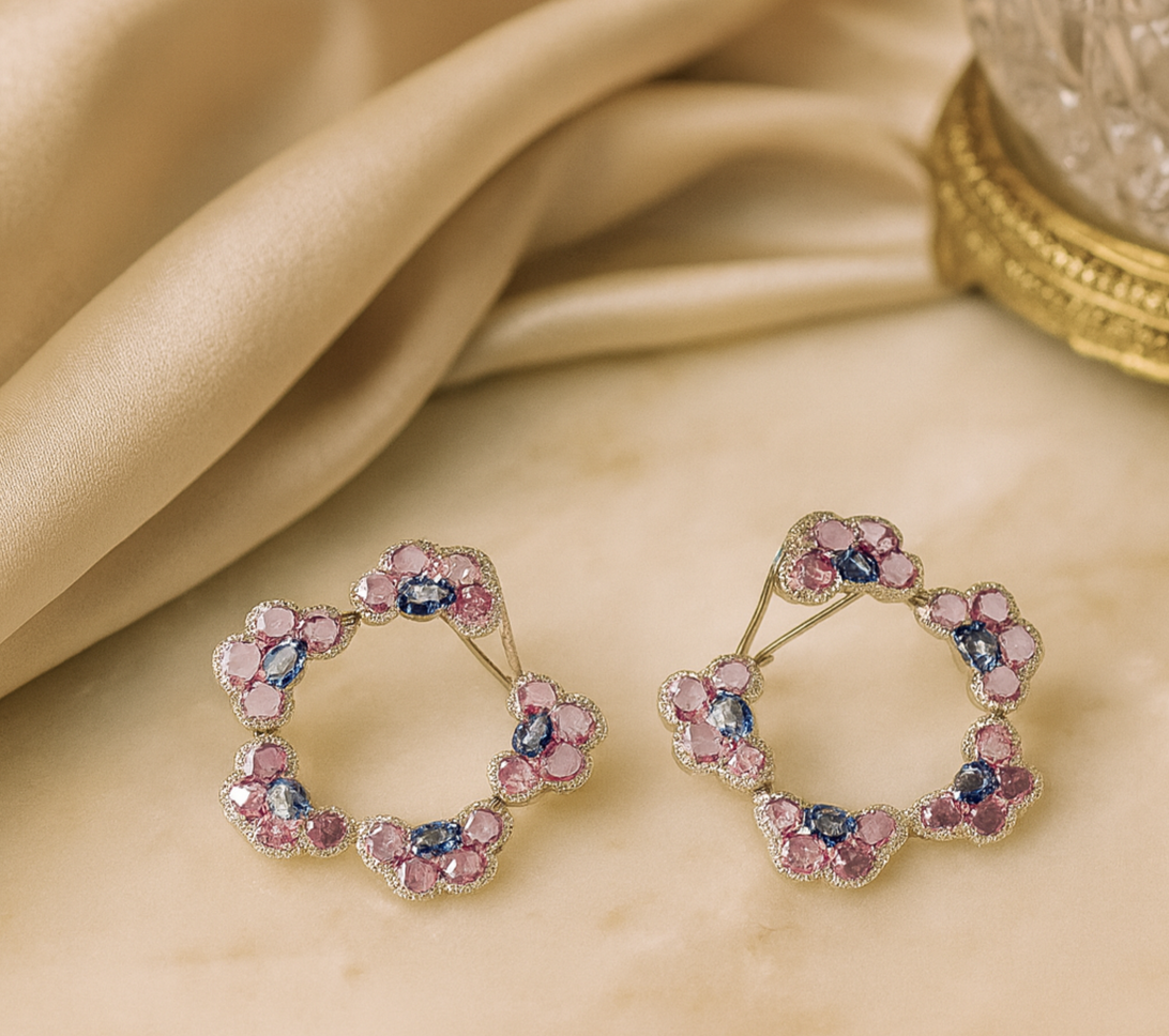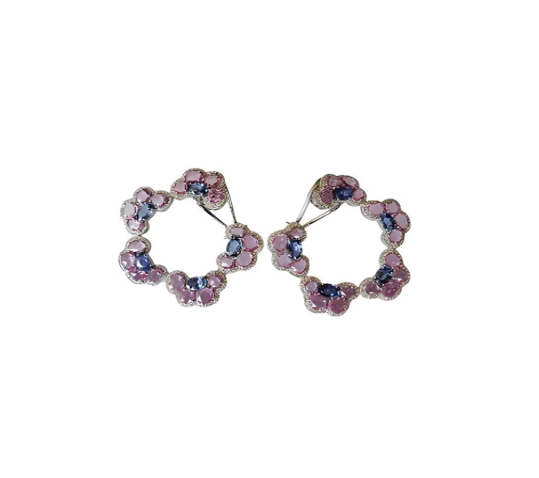 A vibrant study in color and sculptural elegance, the Petal Bloom Hoops blend the romantic glow of pink sapphire with the vivid depth of blue sapphire, all illuminated by the refined sparkle of diamonds. Their fluid, petal-inspired silhouette brings movement and dimension to the design, creating hoops that feel both bold and exquisitely feminine.