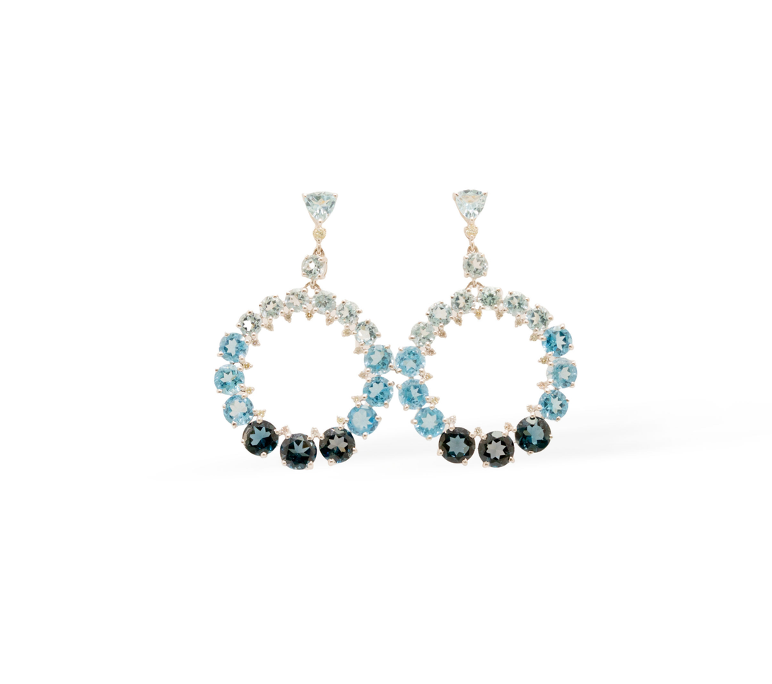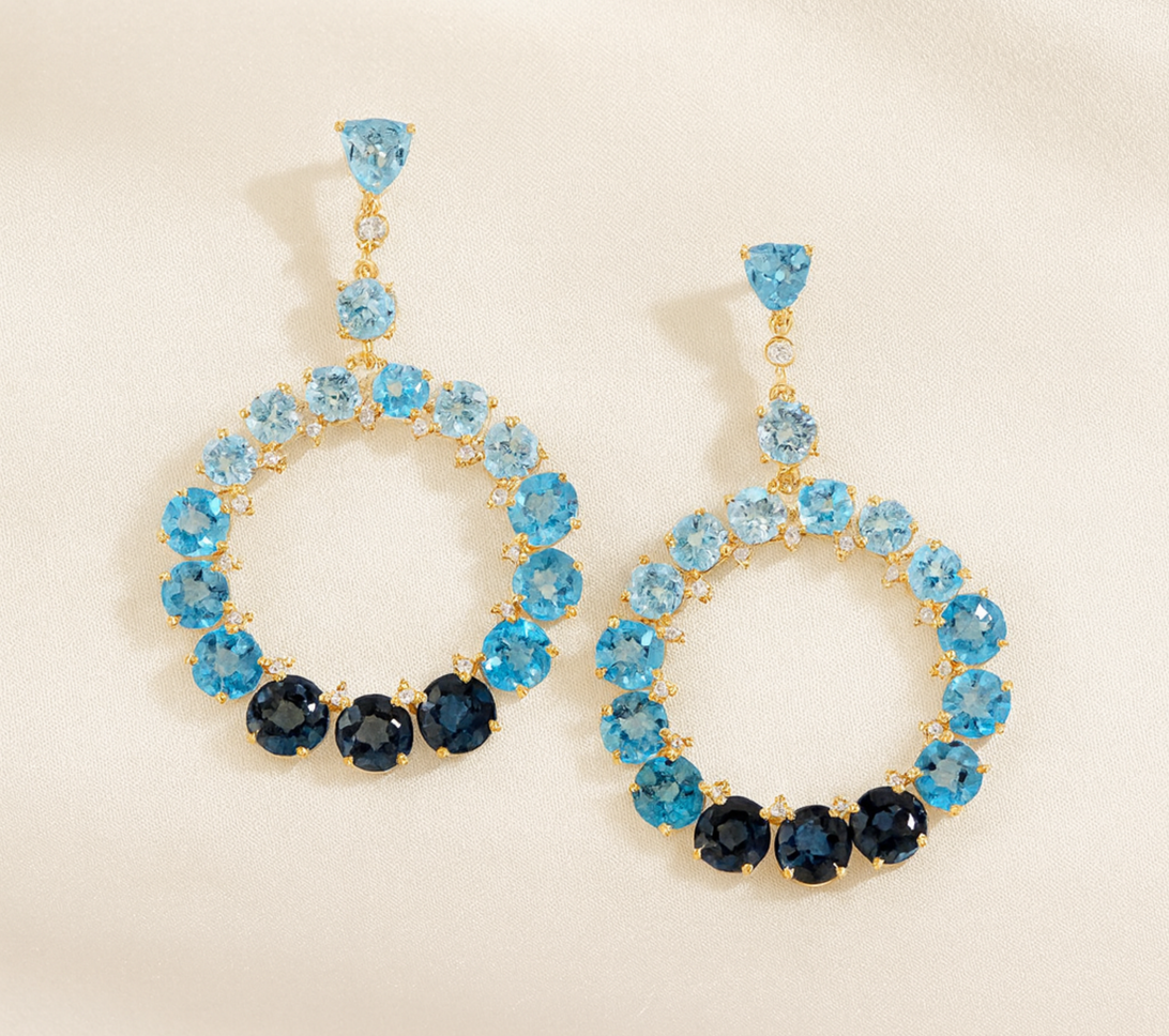 A mesmerizing cascade of blue tones defines the Silver Azure Halo Earrings. Crafted in silver, these earrings feature a stunning trio of London, Swiss, and Sky Blue Topaz gemstones accented by brilliant diamonds. Their radiant hues evoke the depth and clarity of ocean light — refined, refreshing, and endlessly elegant.
