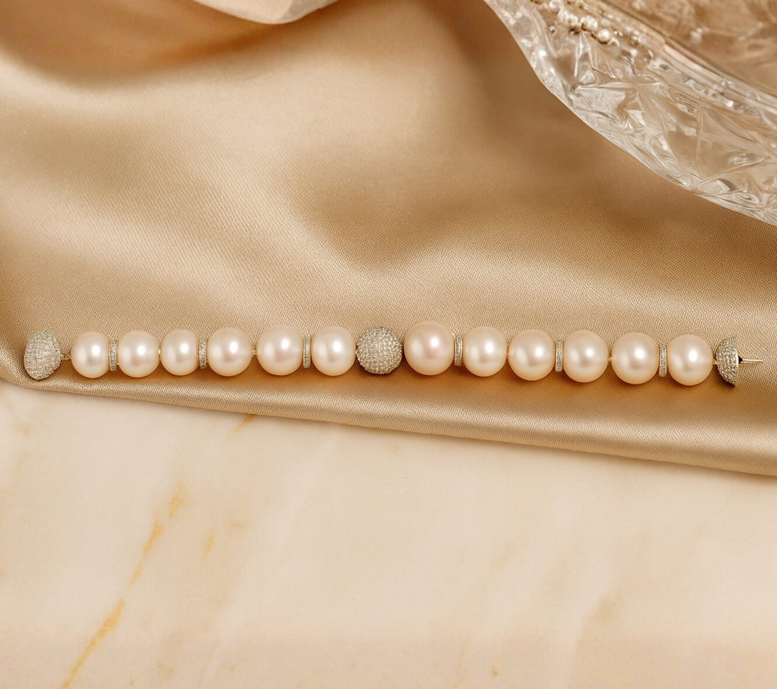 The Snow White Tahitian Pearl Bracelet embodies timeless grace and luminous sophistication. Each pearl — hand-selected for its flawless surface and soft iridescence — glows with natural elegance, creating a seamless rhythm of purity and refinement. The design is accentuated with pavé-set diamond spacers, adding a whisper of brilliance that enhances the bracelet’s fluid beauty.