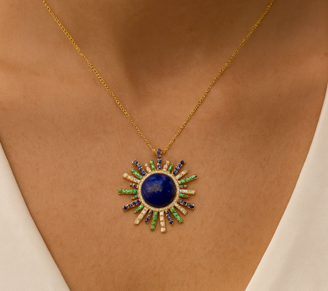 Radiating bold elegance, the Soleil Royale Pendant features a deep blue lapis center surrounded by rays of emerald, sapphire, and white accents—each stone set in luminous 18K yellow gold.
