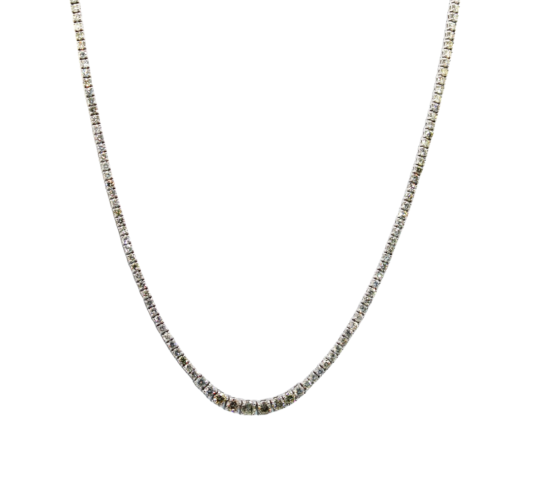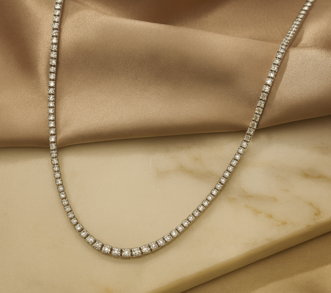The Tennis Necklace is the ultimate expression of timeless sophistication. Crafted with a continuous line of dazzling round-cut diamonds, this classic piece captures effortless elegance and versatility. Each stone is meticulously set to ensure maximum brilliance and seamless fluidity, allowing the necklace to catch the light with every movement. Whether layered or worn solo, it adds a touch of refined glamour to any look — from day to evening.