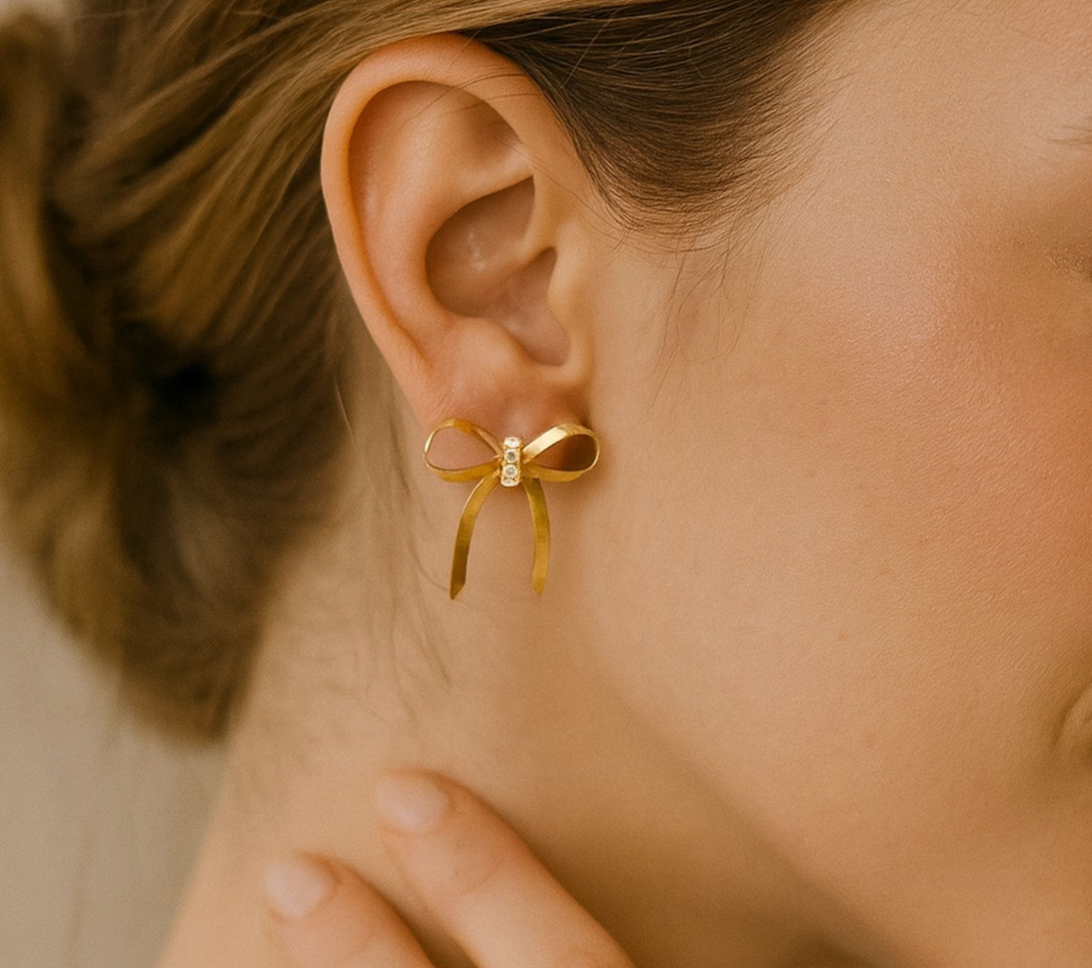 Graceful and timeless, the Tied in Gold Earrings capture the essence of refined femininity. Each earring features a delicate bow silhouette accented with a sparkling diamond at the center. Lightweight yet striking, they’re perfect for both everyday sophistication and special occasions.