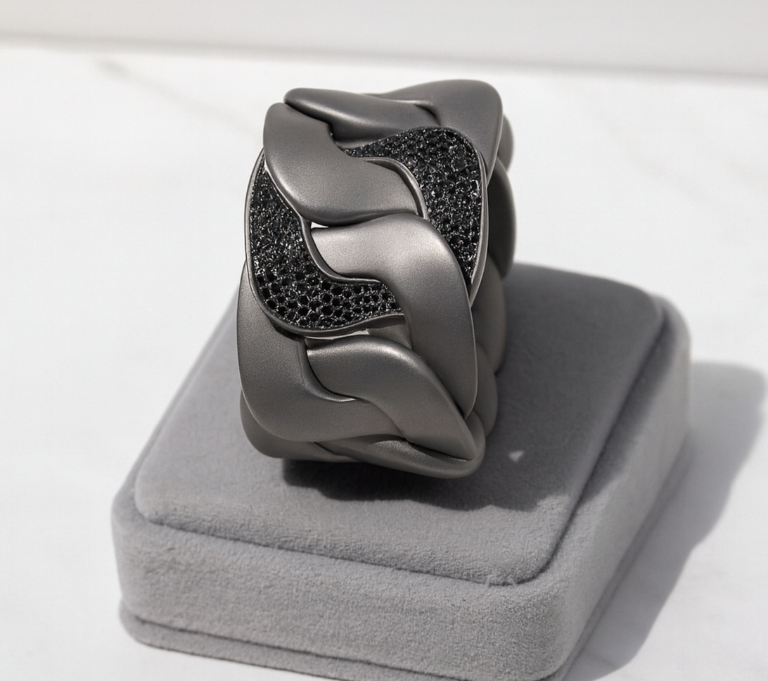 Dark, sleek, and effortlessly architectural — the Titanium Link Bracelet captures the essence of modern luxury. Crafted from cool matte titanium, each oversized link flows with sculptural fluidity, creating a bold silhouette that feels both powerful and refined. Sweeping pavé panels of black diamonds add a dramatic depth and magnetic sparkle, amplifying the bracelet’s contemporary edge.