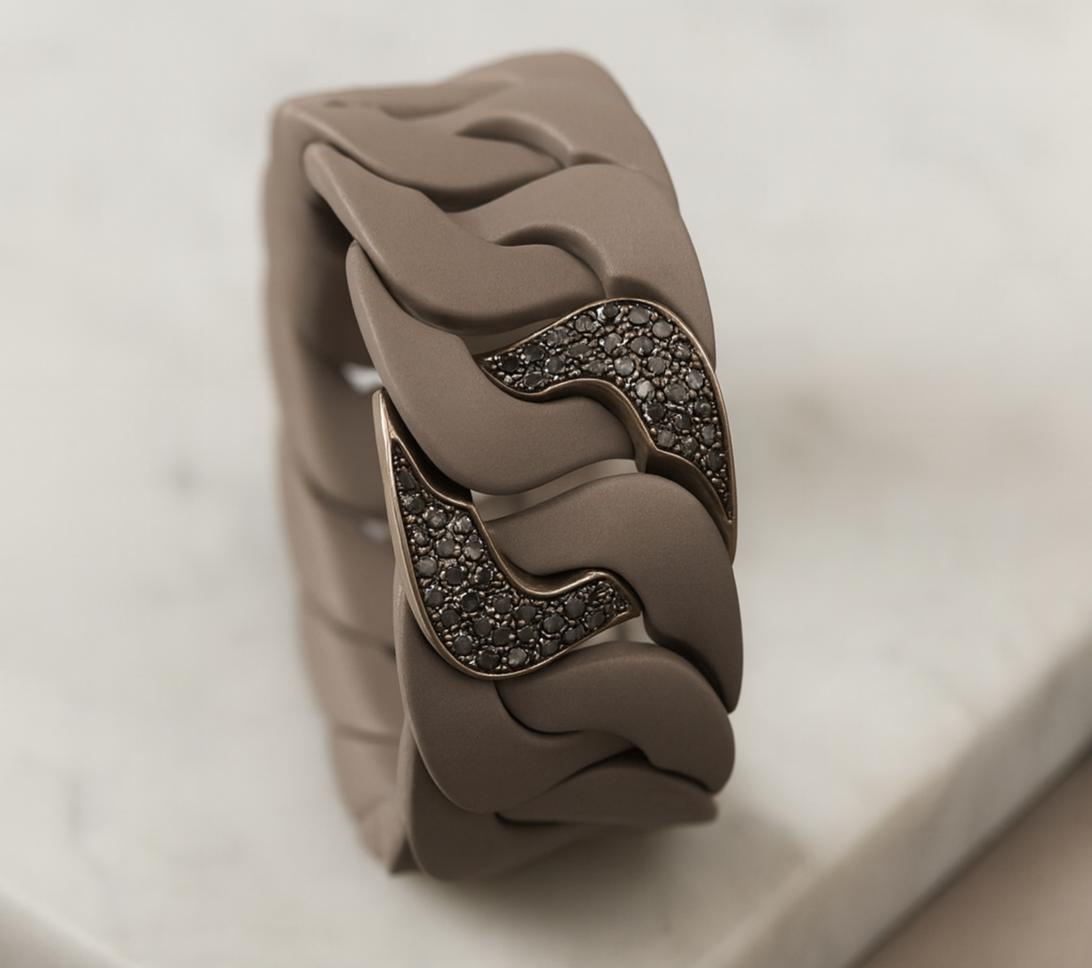 Refined, sculptural, and effortlessly sophisticated — the Titanium Link Bracelet in Natural Titanium brings a soft, contemporary edge to the classic chain silhouette. Its oversized satin-matte links are shaped with smooth, fluid curves, creating a bold yet understated architectural presence. Panels of black diamonds, framed in matching deep-toned metal, add a moody shimmer and striking contrast against the natural titanium finish.
