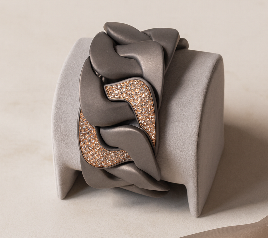 Clean, sculptural, and quietly powerful — the Titanium Link Bracelet in Natural Titanium redefines contemporary elegance. Each oversized link is shaped with soft, fluid curves and finished in a refined satin-matte tone, giving the piece its signature modern depth.