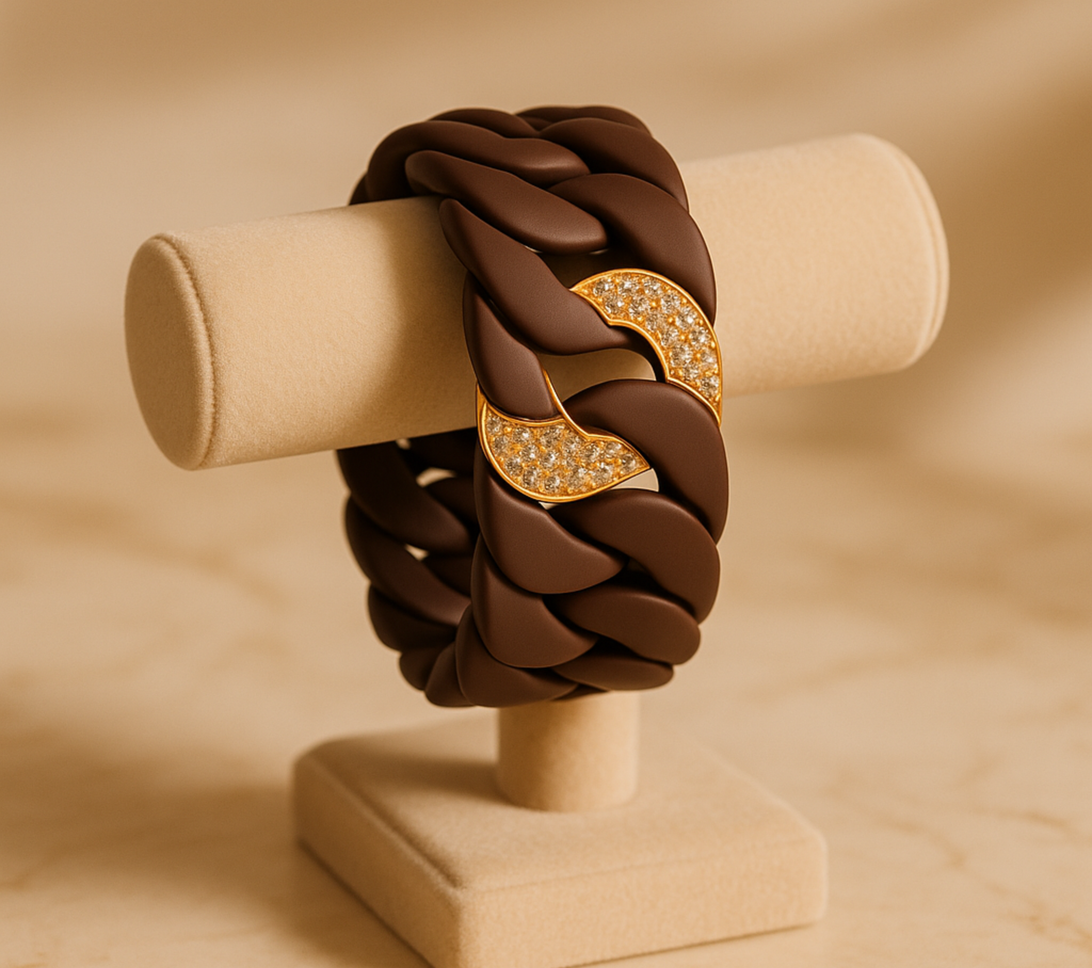 Warm, bold, and irresistibly sculptural — the Titanium Link Bracelet in deep bronze titanium pairs fluid modern design with luxurious detailing. Each oversized link is crafted with smooth, satin-matte curves that create a powerful yet elegant silhouette on the wrist. Accented with sweeping pavé sections of brown diamonds, delicately framed in pink gold, this bracelet glows with refined warmth.