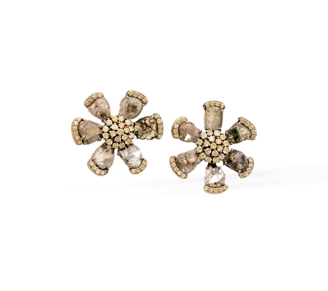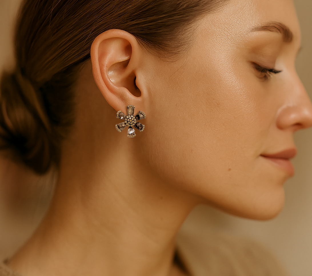 Inspired by nature’s delicate beauty, the Twilight Fleur Earrings feature a sculptural floral design set in warm gold tones. Each petal showcases raw, textured stones that shimmer with earthy elegance, while the pavé-set center adds a refined touch of brilliance. A perfect balance between organic artistry and timeless sophistication — these earrings make a statement from day to evening.