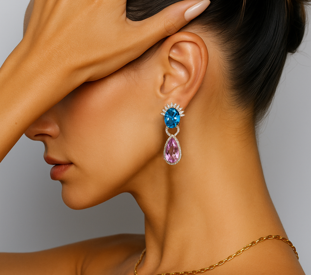 The Violet Horizon Earrings illuminate the perfect balance between serenity and brilliance. Crafted in Silver 925, each earring features a striking duet of gemstones — radiant blue topaz (22.99 ct) and soft violet amethyst (15.46 ct) — gracefully framed by pavé-set diamonds that total 1.42 carats. The teardrop silhouette and delicate halo setting create a mesmerizing interplay of light, evoking the tranquil beauty of twilight skies meeting the sea.