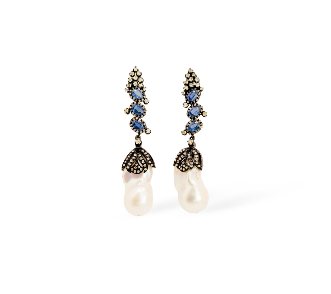 A poetic fusion of nature and luxury, the Wild Bloom Sapphire Earrings feature cascading blue sapphires leading to baroque pearls crowned with intricate antique-inspired caps. This design captures the organic beauty of wild blossoms in full bloom.